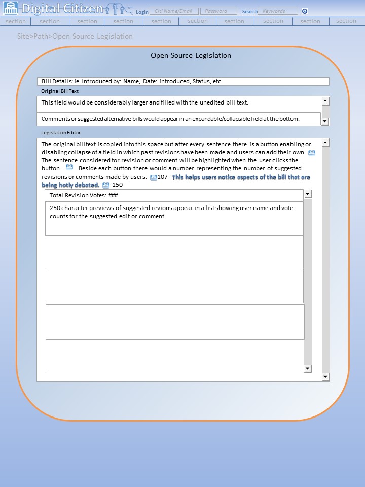 Legislation under debate in congress will be displayed in full and the text broken down into paragraphs and sentences which can be commented on individually and “voted up” or down as part of the bill. When revisions are voted up they are moved to the top of the suggested revisions list. The original text remains intact unless the author of the bill changes the actual bill in Congress. Politicians themselves will be strongly encouraged to use this tool by commenting and recommending revisions to show the public why they support or oppose bills based on their inner workings. This tool can also help shape legislative outcomes by giving representatives impressions of the popularity for certain aspects of a bill, in addition, empowering people to show support or opposition to the bill as a whole.
